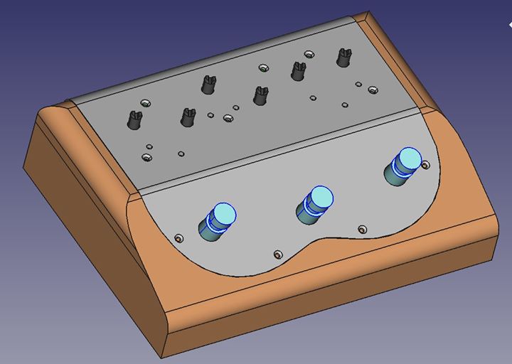Die Drehknöpfe werden für die Klein-Serie rein in Alu ausgeführt. Dem Abdeckblech wird eine geschwungene Spline-Form spendiert und auch im Holz versenkt. Die Beschriftungen werden natürlich professionell im Siebdruck oder ähnlichem ausgeführt.