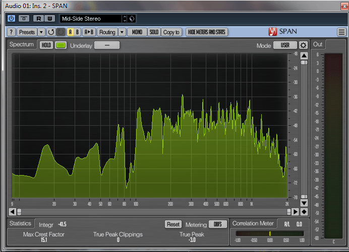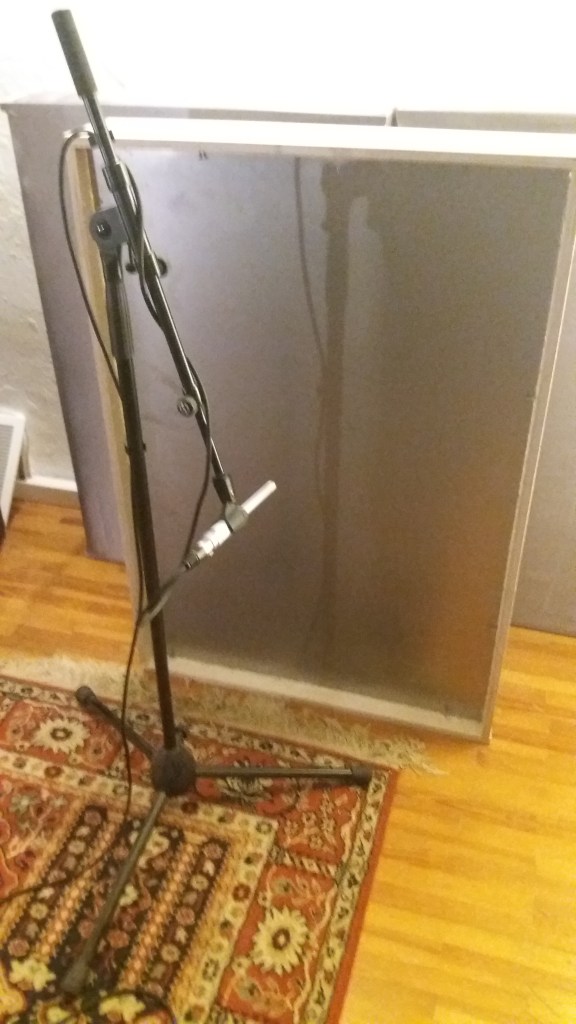 Um zu verifizieren, ob die simulierten (und vorher natürlich auch analytisch berechneten Moden) sich auch in der Wirklichkeit ergeben, wurde der noch offene Rahmen mit Stahlplatte mittels eines Bass-Drum-Klöppels angeschlagen und die sich daraus ergebene „Impuls-Antwort“ mit einer DAW (digital audio workstation) aufgenommen und mit dem Plugin Voxengo SPAN ausgewertet: