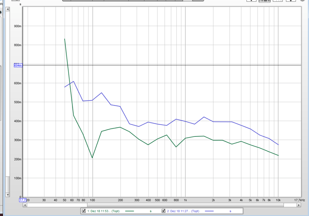 Im folgenden Bild einer klassischen RT60 Darstellung wird das einfacher und klarer dargestellt. Ab 65 Hz ist die „grüne“ Kurve mit 6x VPR niedriger als die „blaue“ des akustisch unbehandelten leeren Raums. Der starke Anstieg unter 50 Hz muss auf eine Mess-Ungenauigkeit durch einen zu leisen Mess-Pegel geschoben werden. Es deckt sich mit keiner der oberen Messungen.