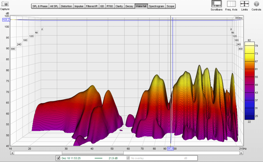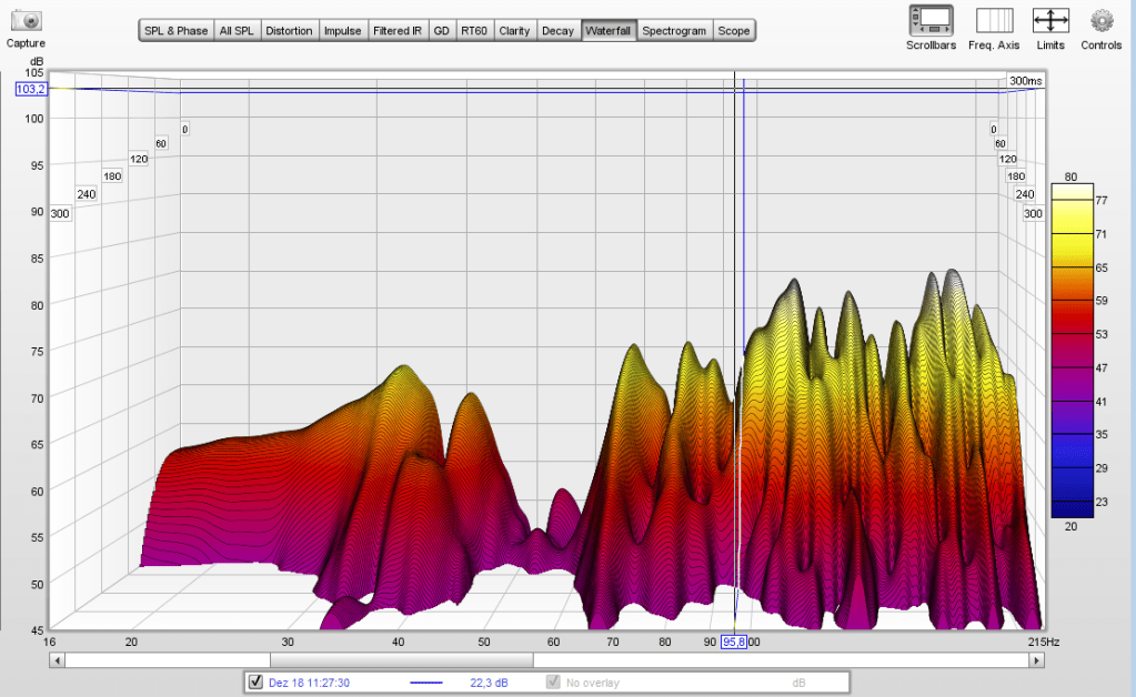 Im wesentlichen bestätigt sich hier die Voxengo-Impuls-Antwort! Im unteren Bereich unter 50 Hz zeigt sich nur wenig Wirkung. (Die Absorber wurden auch „frei“ aufgestellt, später fest an den Wänden verschraubt. Diese könnte die Tief-Bass-Wirkung stark beeinträchtigen. Diese „fest-verschraubte“ Messung wurde aber noch nicht durchgeführt). Bei 50 Hz zeigt sich auch die bereits oben erwähnte Lücke, dennoch ist hier ein Rückgang der Nachhallzeit festzustellen. Die stärkste Wirkung, das heißt Reduzierung der Nachhallzeit, ist ab dieser Lücke dann von 60 Hz – 200 Hz festzustellen. Es interessiert hierbei nicht die Amplitude in z-Richtung, sondern die Nachhallzeit in die y-Zeichen-Ebene hinein! Bei 65 Hz z.B geht diese von über 350 ms auf 180 ms zurück. Das ist ein Faktor 2 und daher sehr zufriedenstellend.